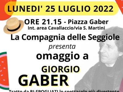Il 25 luglio alle ore 21.15 in Piazza Gaber (interno area Cavallaccio/via S.Martini) La Compagnia delle Seggiole presenta OMAGGIO A GIORGIO GABER, letture e situazioni "radiofoniche" con canzoni dal vivo. L'evento, ad ingresso libero, è promosso nell'ambito dell'Estate al Quartiere 4 nella piazza appena dedicata al grande cantautore italiano.,