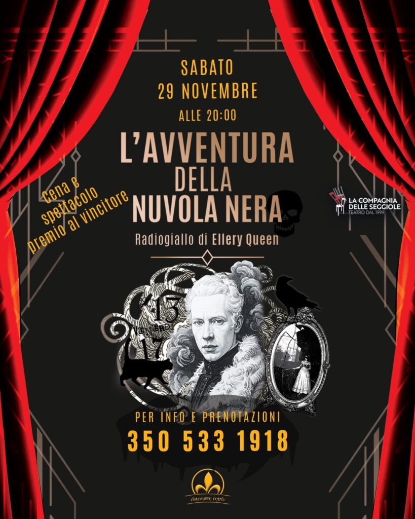 La Compagnia delle Seggiole e il Ristorante Retrò di Firenze (Piazza San Marco, 9R) vi invitano sabato 29 novembre 2025 a L’avventura della nuvola nera, una cena-spettacolo con un nuovo radiogiallo di Ellery Queen, portato per la prima volta in scena al Ristorante Retrò.