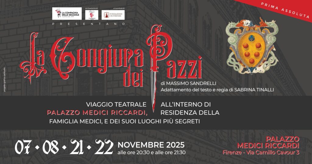 Un nuovo viaggio teatrale firmato La Compagnia delle Seggiole: all’interno di Palazzo Medici Riccardi, la storia della Congiura dei Pazzi rivive nei luoghi del potere mediceo. Ideato da Massimo Sandrelli con la regia di Sabrina Tinalli, lo spettacolo conduce il pubblico nel cuore del Rinascimento fiorentino. Il 7, 8, 21 e 22 novembre 2025, con doppia replica serale e visita straordinaria alla Cappella dei Magi.