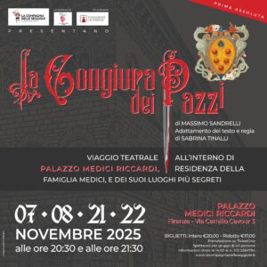 Un nuovo viaggio teatrale firmato La Compagnia delle Seggiole: all’interno di Palazzo Medici Riccardi, la storia della Congiura dei Pazzi rivive nei luoghi del potere mediceo. Ideato da Massimo Sandrelli con la regia di Sabrina Tinalli, lo spettacolo conduce il pubblico nel cuore del Rinascimento fiorentino. Il 7, 8, 21 e 22 novembre 2025, con doppia replica serale e visita straordinaria alla Cappella dei Magi.
