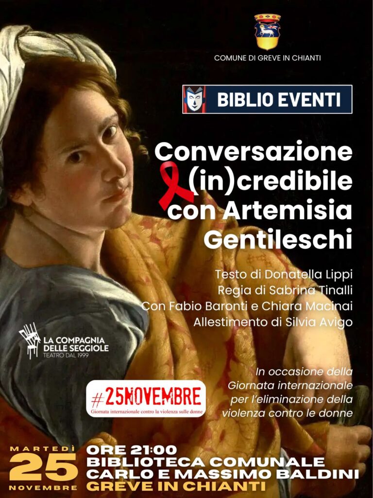 In occasione della Giornata internazionale per l’eliminazione della violenza contro le donne, la Compagnia delle Seggiole torna a Greve in Chianti con un nuovo e intenso appuntamento del ciclo Biblio Eventi: “Conversazione (in)credibile con Artemisia Gentileschi”, in programma martedì 25 novembre alle ore 21:00 presso la Biblioteca Comunale Carlo e Massimo Baldini.