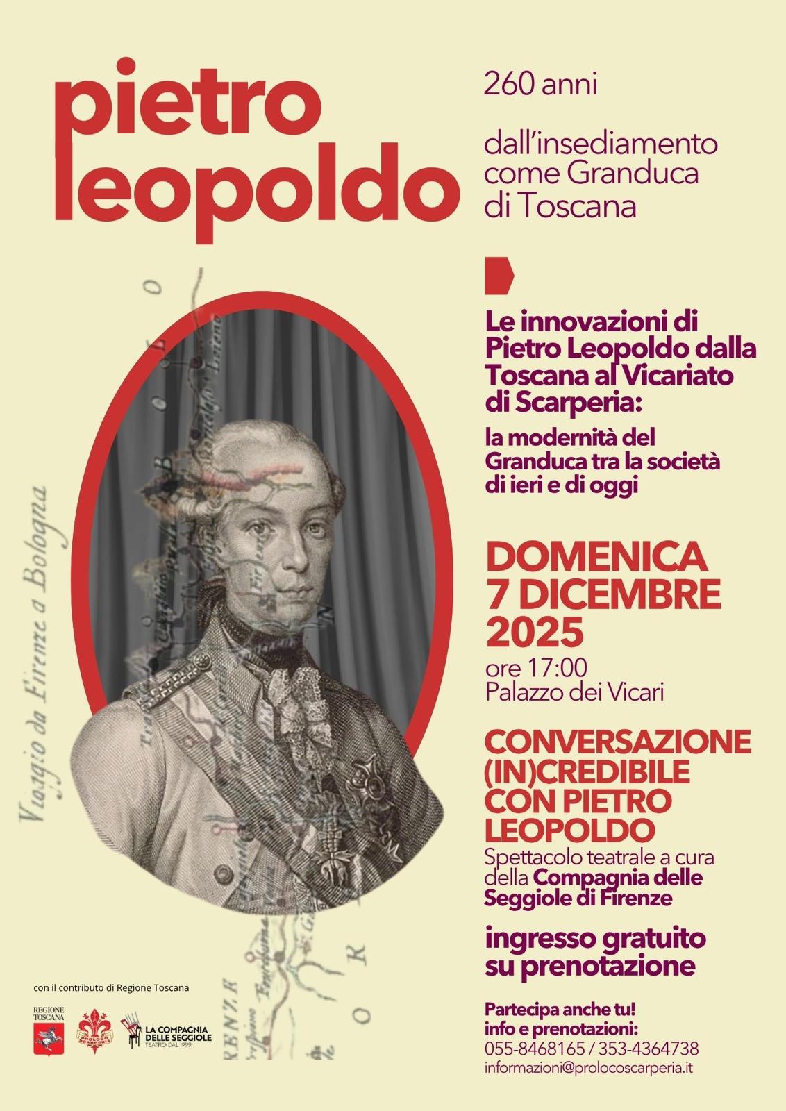 Domenica 7 dicembre 2025, alle ore 17:00, la Compagnia delle Seggiole sarà protagonista al Palazzo dei Vicari di Scarperia con Conversazione (in)credibile con Pietro Leopoldo, uno spettacolo teatrale dedicato alla figura di uno dei sovrani più illuminati della storia toscana.
