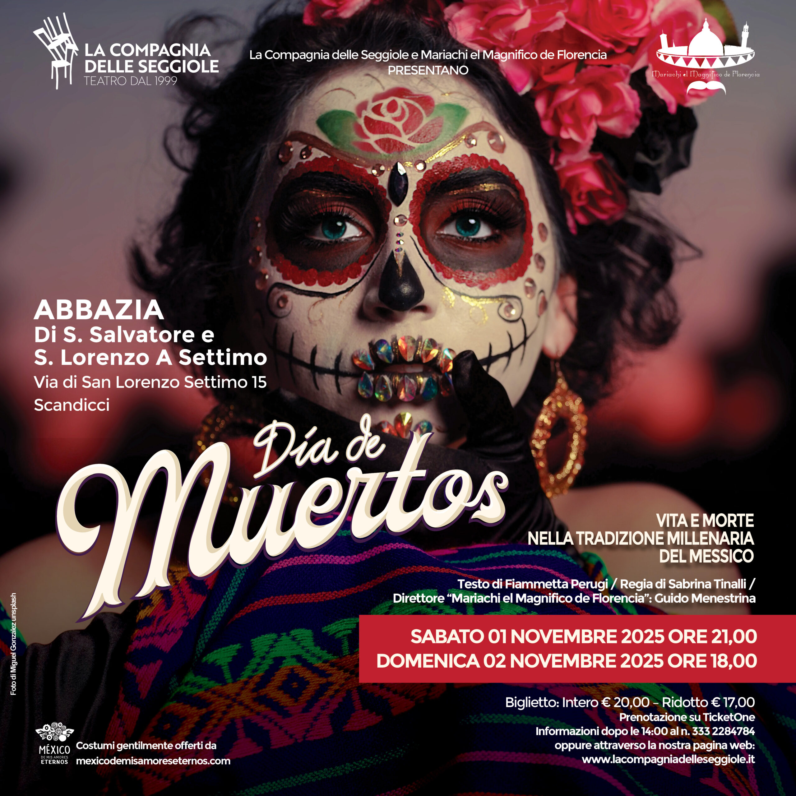 La Compagnia delle Seggiole e Mariachi el Magnifico de Florencia sono lieti di presentare, per il terzo anno consecutivo, lo spettacolo DIA DE MUERTOS dedicato alla antica tradizione messicana di onorare i defunti. Doppio apuntamento il 1 e 2 novembre 2025 nella nuova location dell’Abbazia di San Salvatore e San Lorenzo a Settimo a Scandicci.