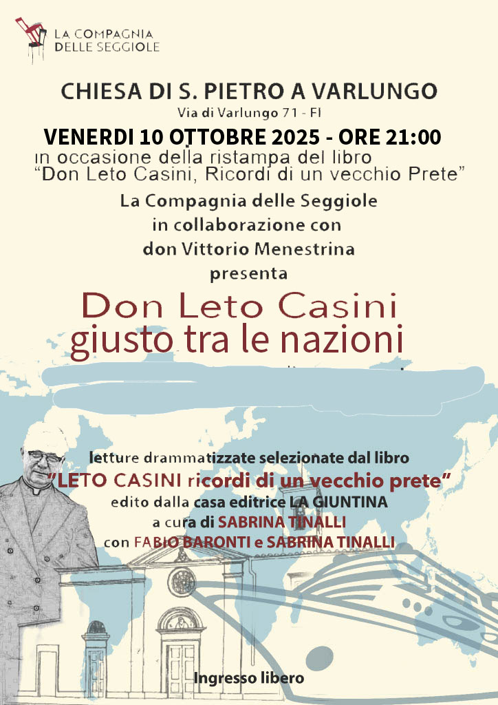 In occasione della nuova edizione di Ricordi di un vecchio prete, la Compagnia delle Seggiole presenta Don Leto Casini, migrante fra i migranti: letture drammatizzate che attraversano la vita di un sacerdote fiorentino, Giusto tra le Nazioni (1966), parroco di Varlungo durante la guerra e per anni cappellano degli emigranti. Ingresso libero fino a esaurimento …