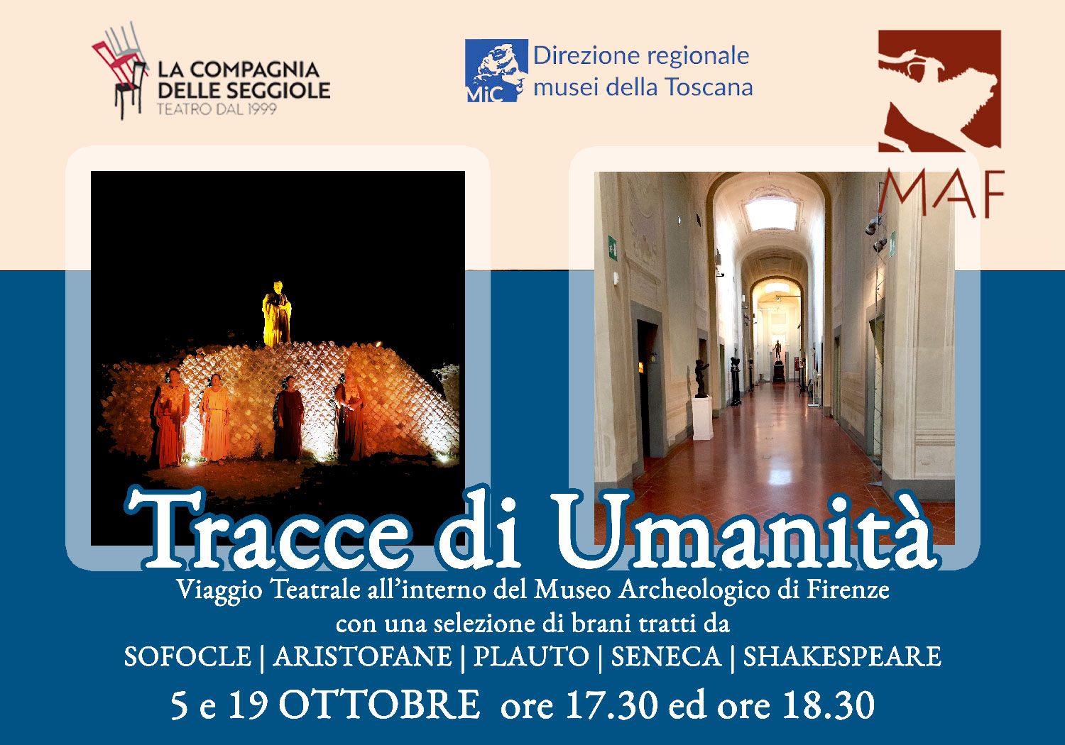 Tracce di Umanità arriva al Museo Archeologico Nazionale di Firenze con due appuntamenti speciali (5 e 19 ottobre 2025). Un viaggio teatrale tra i classici di Sofocle, Aristofane, Plauto, Seneca e Shakespeare, per riscoprire la forza senza tempo della tragedia e della commedia.