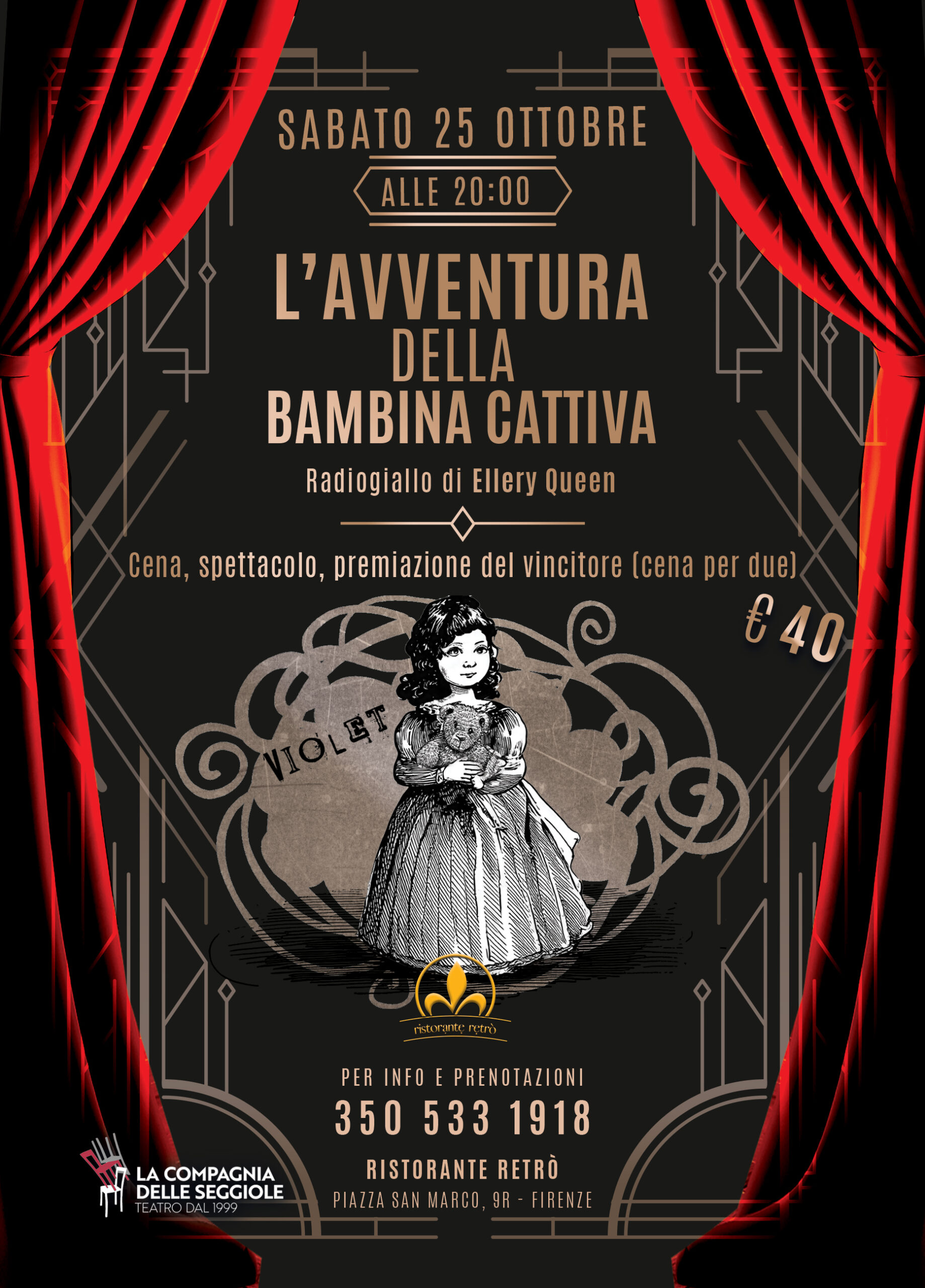 La Compagnia delle Seggiole e il Ristorante Retrò di Firenze (Piazza San Marco 9R) vi invitano sabato 25 ottobre 2025 a “L’avventura della bambina cattiva”, una cena-spettacolo ispirata ai celebri radiogialli. Durante la serata, tra una portata e l’altra, sarete coinvolti nell’ascolto di letture radiofoniche e suoni di scena ricreati manualmente, come si faceva prima dell’era digitale. Sarà …