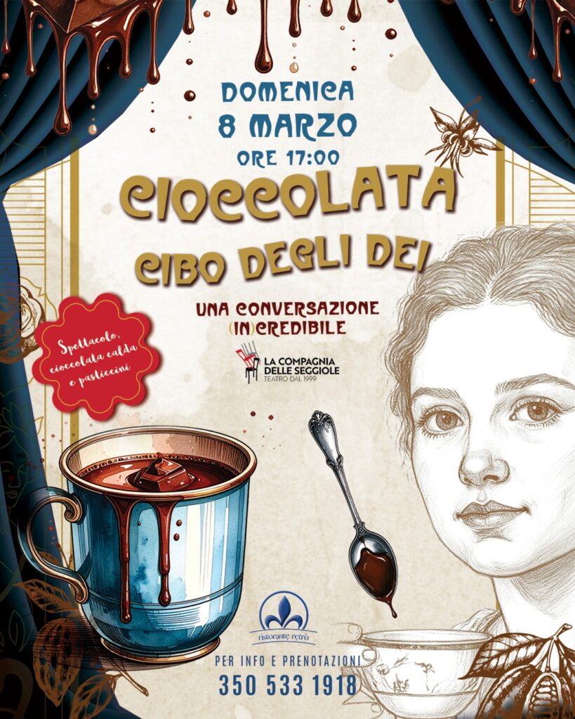 Cioccolata. Cibo degli Dei è una conversazione (in)credibile firmata dalla Compagnia delle Seggiole: un viaggio teatrale tra storia, curiosità e suggestioni dedicate al cacao, accompagnato da cioccolata calda e pasticcini. Appuntamento domenica 8 marzo alle ore 17.00. Prenotazioni: 350 533 1918.