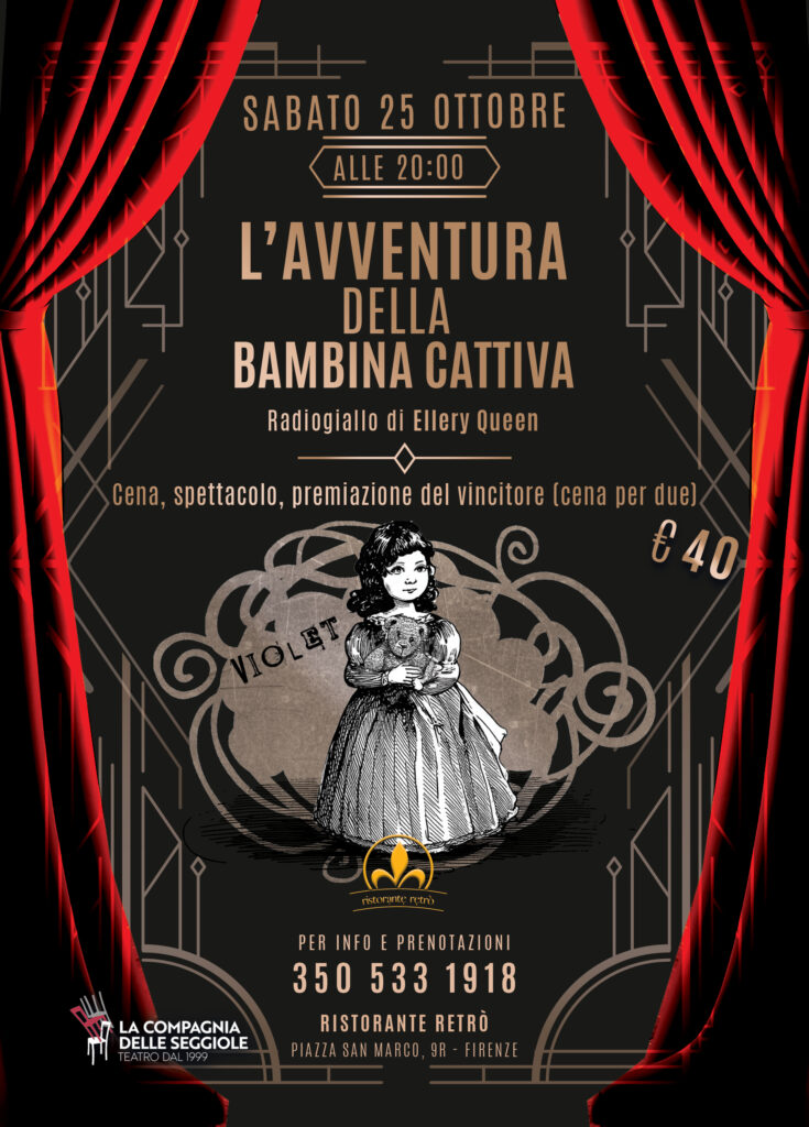 Appuntamento il 25 ottobre 2025 alle ore 20.00 al Ristorante Retrò di Firenze (Piazza San Marco 9R) con L’AVVENTURA DELLA BAMBINA CATTIVA – Radiogiallo di Ellery Queen