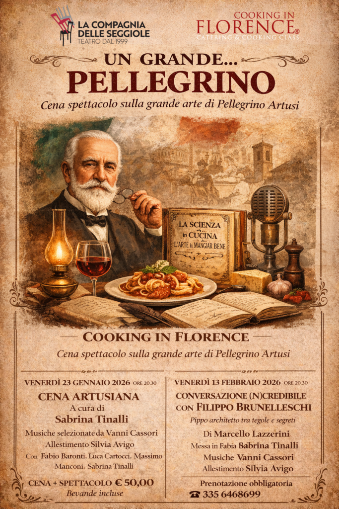 La Compagnia delle Seggiole propone due cene–spettacolo dedicate alla tradizione e alla storia italiana presso Cooking in Florence, in Via Lapo da Castiglionchio 8 a FIRENZE. Venerdì 23 gennaio 2026 va in scena Un grande… Pellegrino, omaggio a Pellegrino Artusi; venerdì 13 febbraio 2026 Conversazione (in)credibile con Filippo Brunelleschi, tra teatro, musica e gusto. Inizio alle ore 20.30.